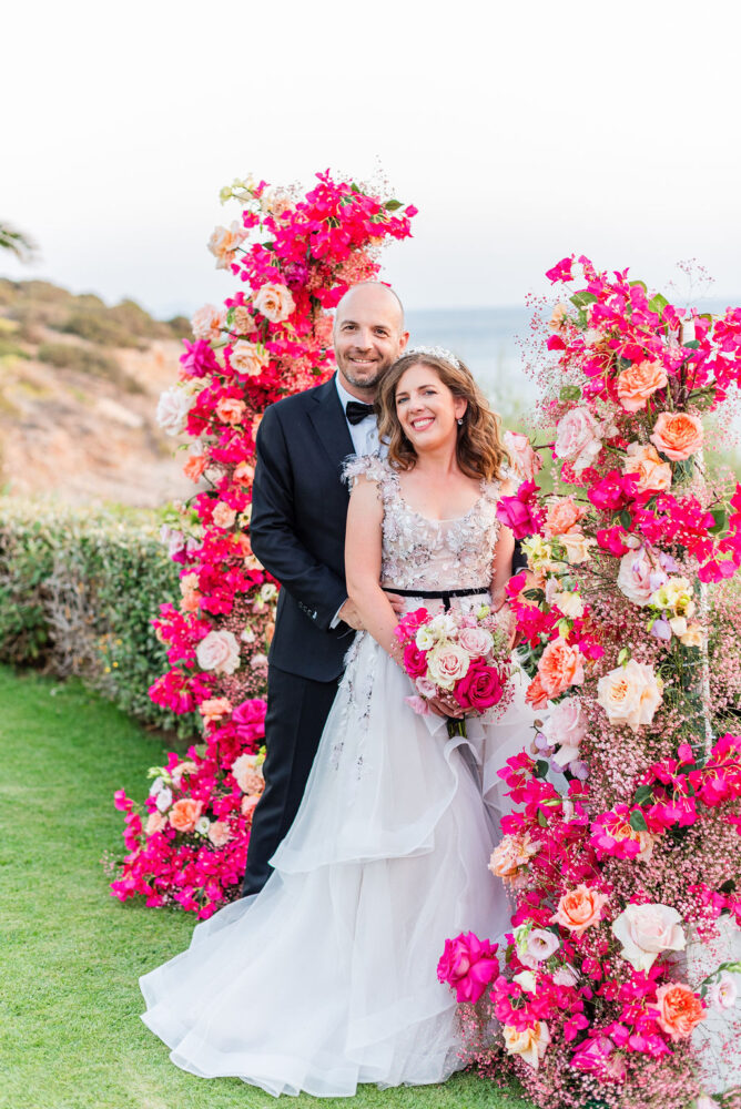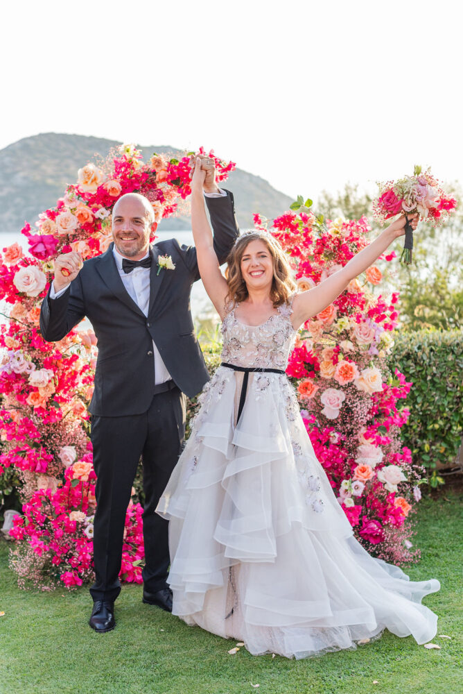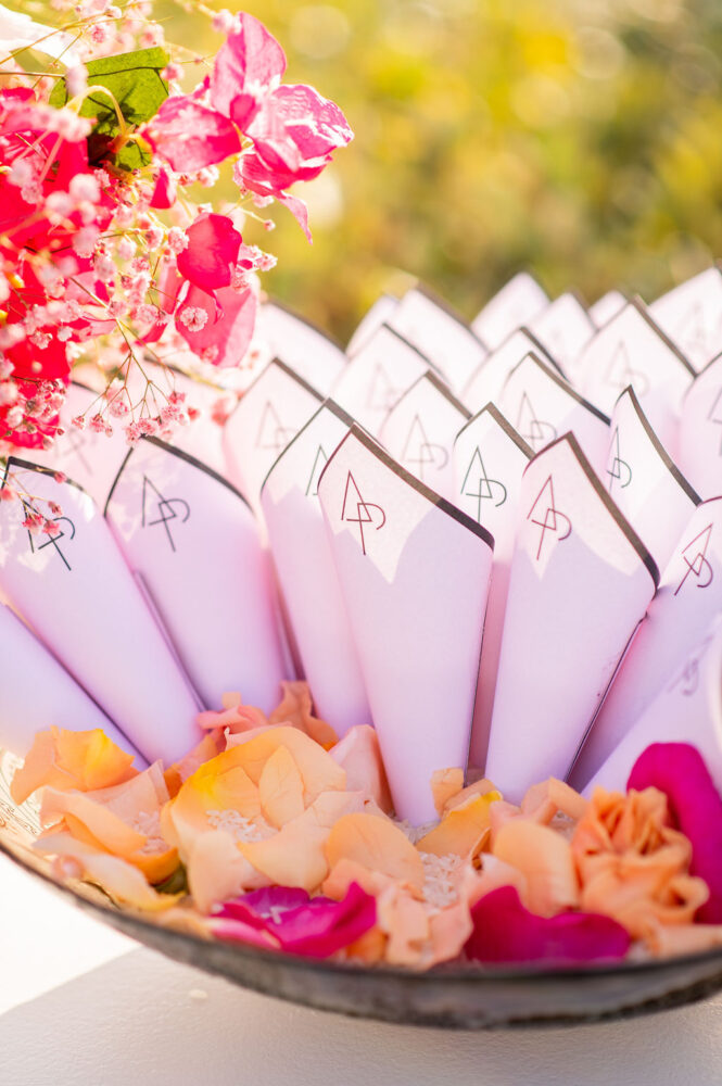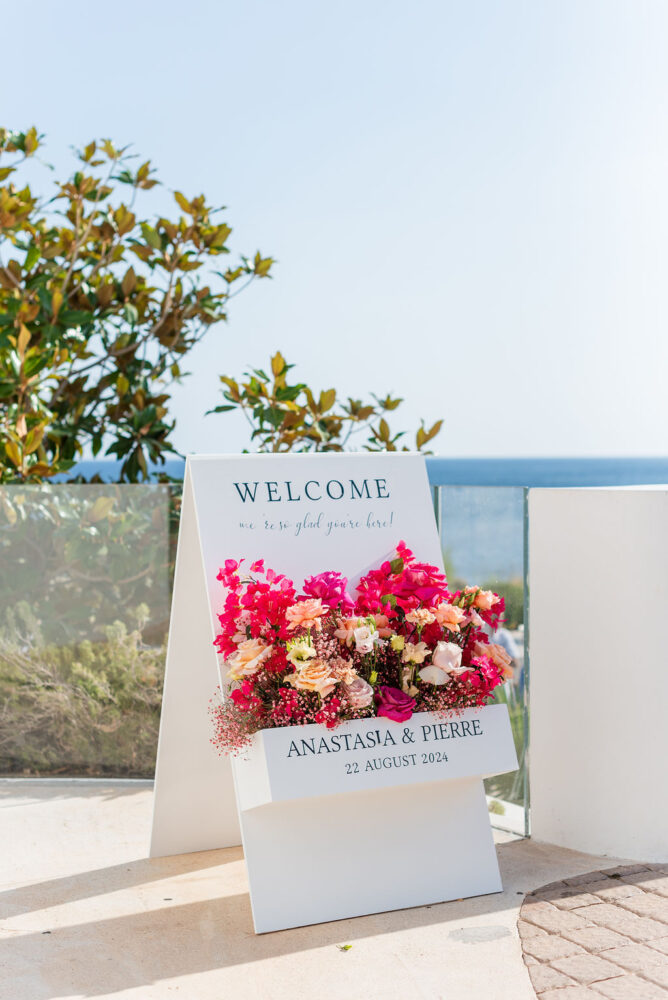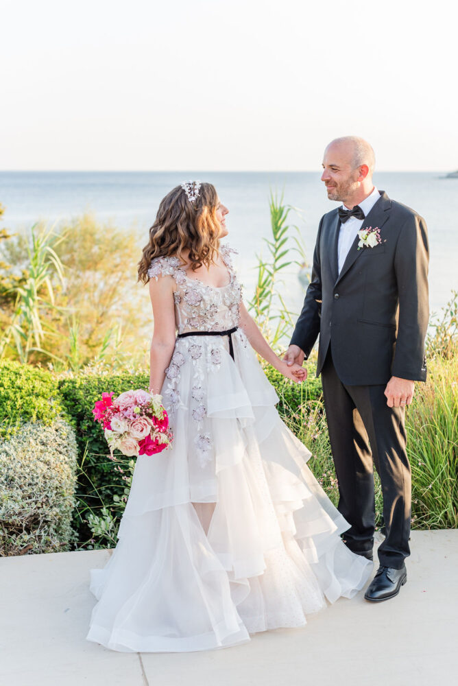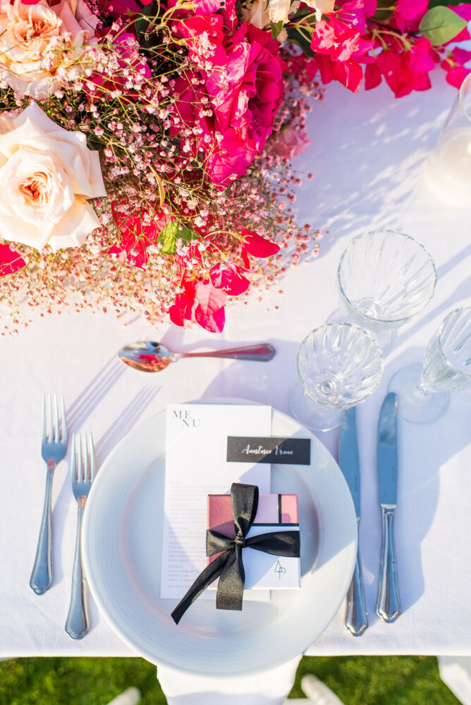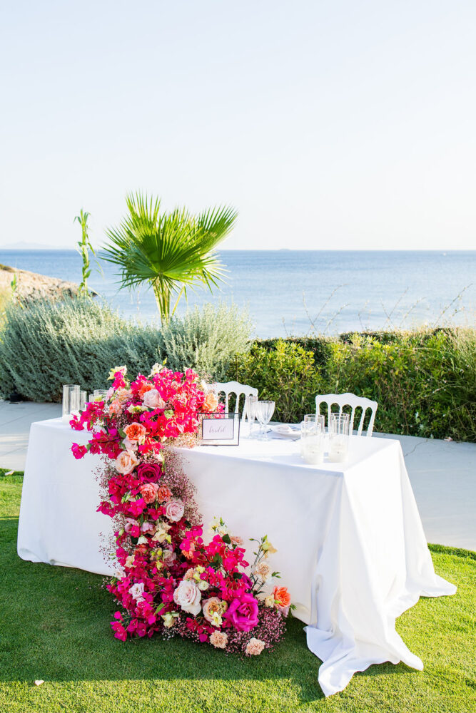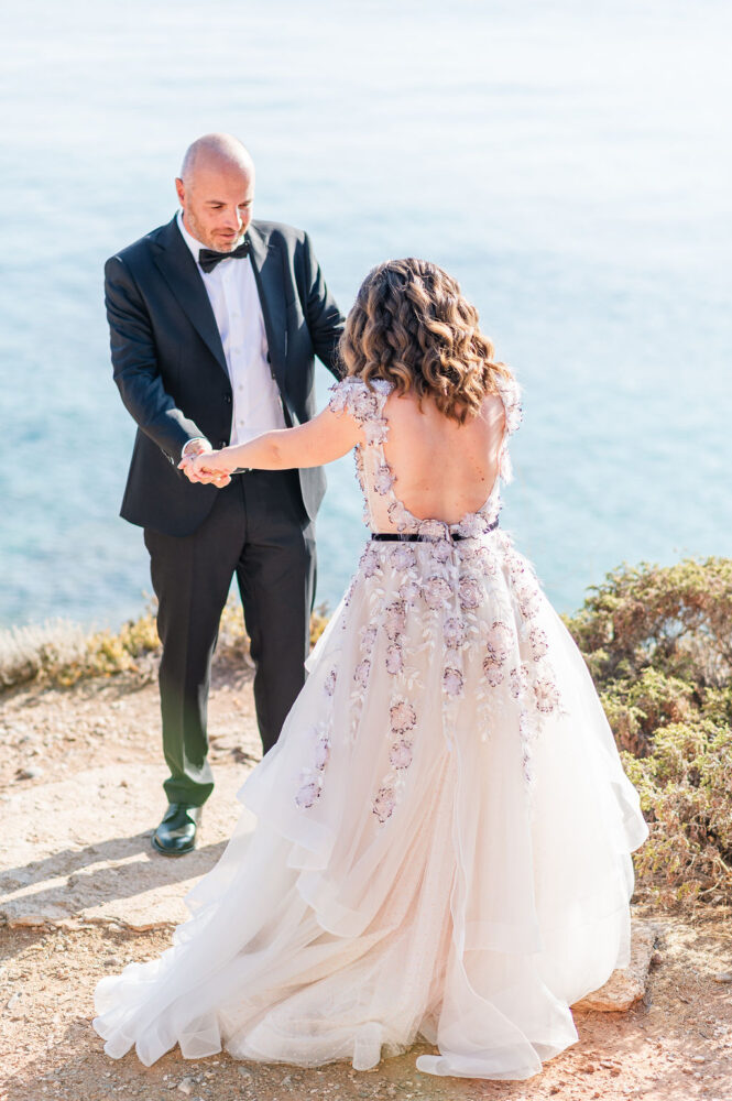 Wedding planner Make my dream Events gave the spectacular seaside scenery an extra “oomph” with opulent flower arrangements, custom monograms, and elegant details.