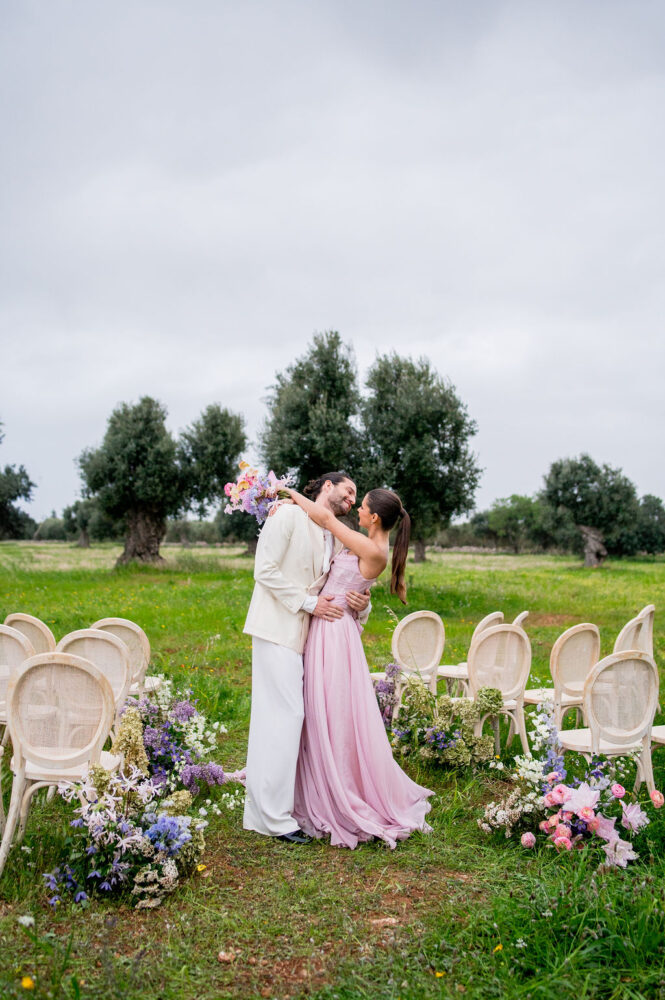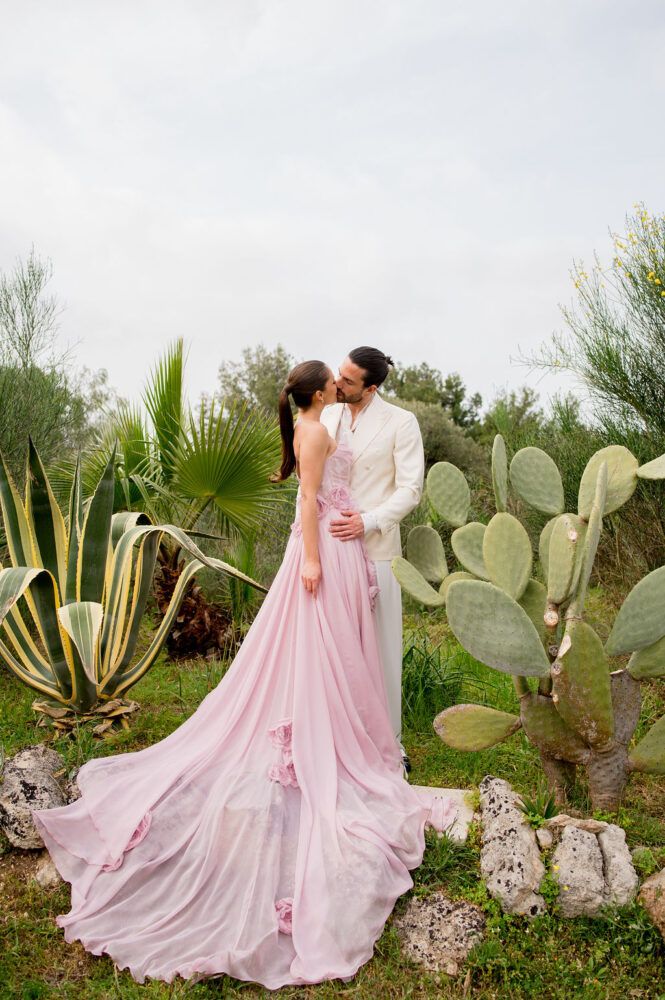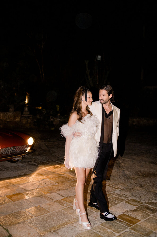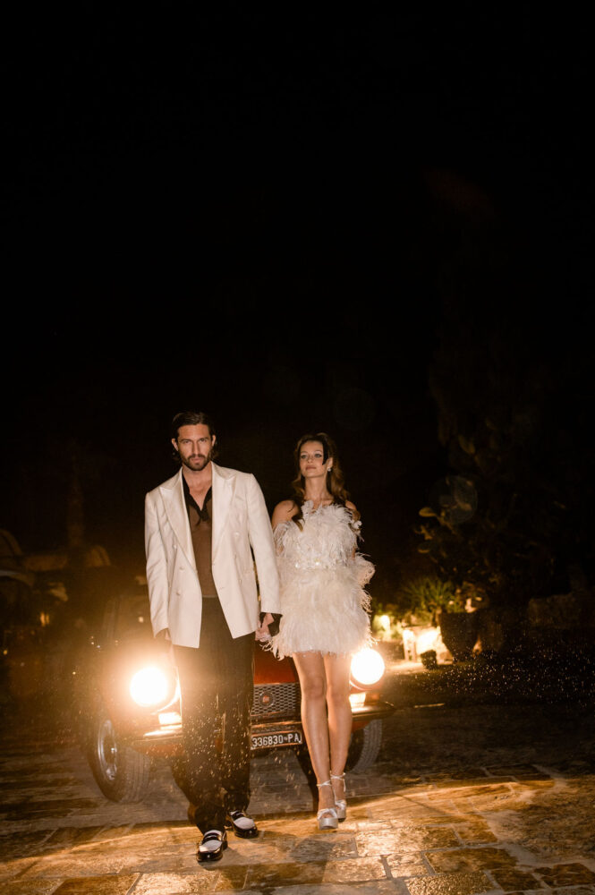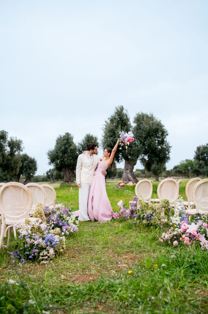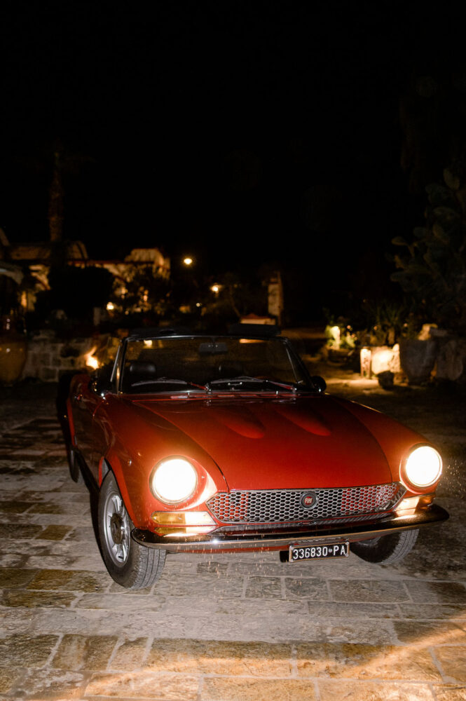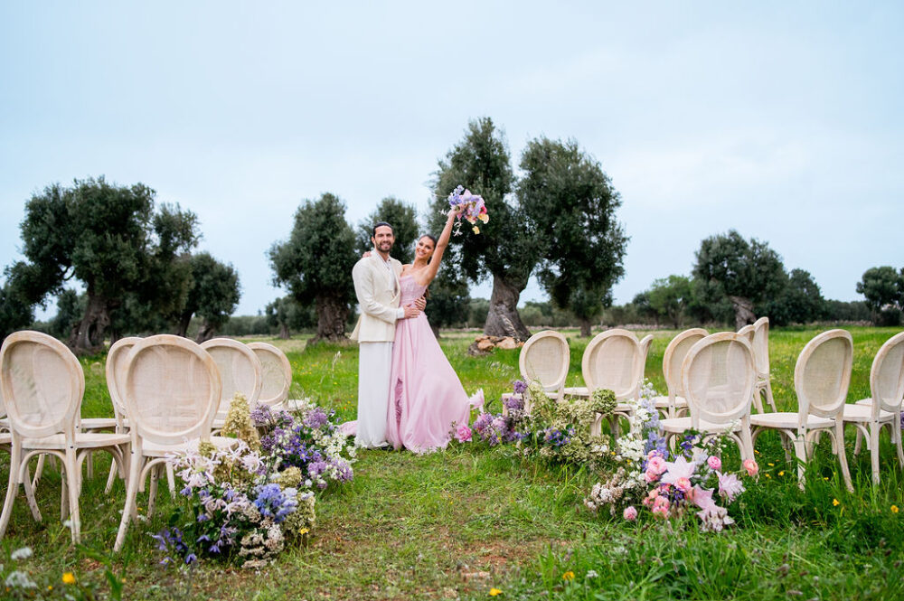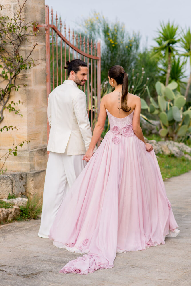Italy never plays background—it steals the scene. In bright Apulia, Katherine and Dylan brought playful color, retro whimsy, and a wink to Wes Anderson. Add a twirling pink dress, a vintage Fiat sprinting in from Rome, and plenty of cool‑couple sparkle.